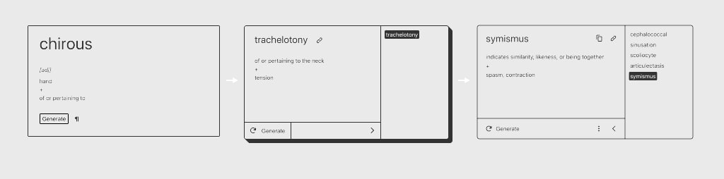 Though version 2 was much faster, more efficient and simplified, it still felt delicate to use as each word just disappeared as soon as the 'Generate' button was hit. The obvious remedy to this was to provide some kind of history functionality, either natively through the browser history or manually through state tracking. The third and current iteration of this project was begun primarily to add this feature, and the latter option was chosen for its implementation.